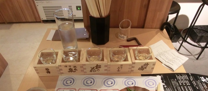 まずは、五蔵セットを注文。「萩の露特別純米」「不老泉山廃特別純米原酒」「松の花純米吟醸」「琵琶長寿特別純米」「竹生嶋純米酒」