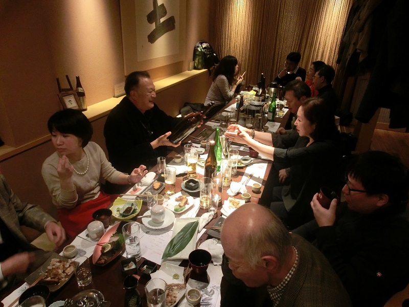 ここでも料理+ビール1杯が決まり事。忘年会のみ参加費4,000円(普段の例会は3,000円)。参加条件は、参加費&日本酒720ml持参が原則。