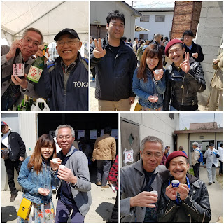 お酒のコーナーには常に小さな行列できます。何度も並んで全」銘柄をコンプリートしました。左端は、製造部長の畠さん。何度も御世話になっています。下のベテラン男性は畠さんのお父様です。そして、若い二人は学生ボランティアだそうです。恥ずかしそうにVサインする姿が新鮮で可愛い。